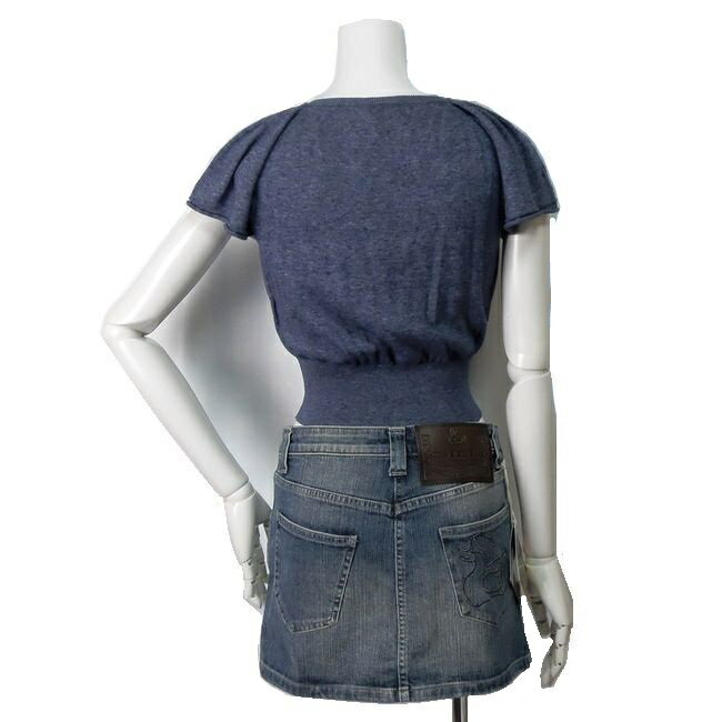 メランジェされたデニムブルーニットの素材感や糸巻のボタン、ウエスト部分のギャザー遣いなどディテールの作り込みなど随所にVALENTINOらしさを感じられる逸品。
