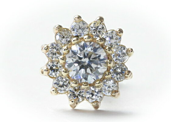 商品説明素材14金 イエローゴールド ゲージバーの太さ:・14ゲージ(1.6mm)太目・16ゲージ(1.2mm)細目 フラワーサイズ直径約7mm商品についてキラキラと輝く上質なクリアキュービックジルコニアを使った高品質なフラワーラブレットピアスです。
